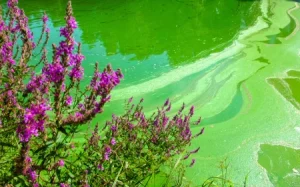 Blue-green algae form blooms in stagnant or slow-moving water, especially during hot weather. These blooms can appear green, blue-green, or brown, and may resemble scum or floating paint on the water’s surface, being able to cause severe illness or death in dogs if ingested even in small amounts.